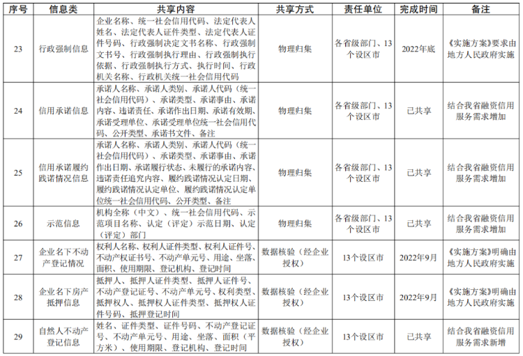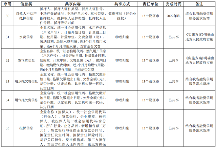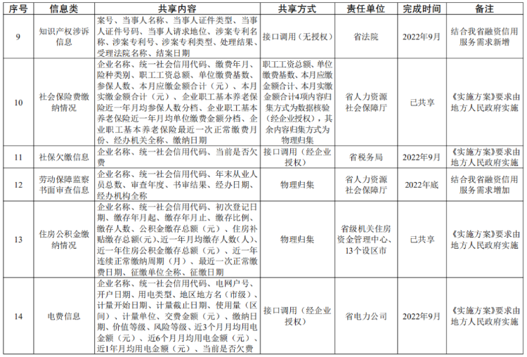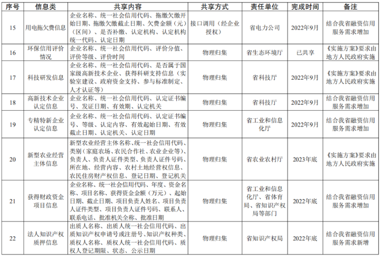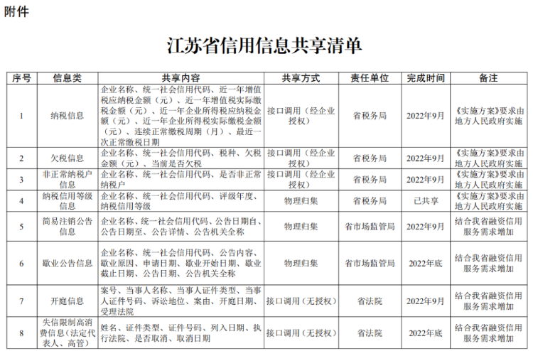 省政府办公厅关于印发江苏省加强信用信息共享应用促进中小微企业融资若干措施的通知 (苏政办发〔2022〕59号) 各市、县(市、区)人民政府,省各委办厅局,省各直属单位: 《江苏省加强信用信息共享应用促进中小微企业融资若干措施》已经省人民政府同意,现印发给你们,请认真贯彻实施。 江苏省人民政府办公厅 2022年7月16日 (此件公开发布) 江苏省加强信用信息共享应用促进中小微企业融资若干措施 为有效破解银企信息不对称,提升金融机构、地方金融组织服务中小微企业融资效率,力争用三年左右时间,实现融资信用服务平台实名注册中小微企业达到150万户,平台普惠贷款余额超过4000亿元,占全省普惠型小微企业贷款余额比重、信用贷款余额占比达到20%以上,推动中小微企业融资可得性、便利度明显提高,信用贷款持续提升,根据《国务院办公厅关于印发加强信用信息共享应用促进中小微企业融资实施方案的通知》(国办发〔2021〕52号),提出如下工作措施。 ▍一、建立健全融资信用服务平台 1.建设全国中小企业融资综合信用服务平台江苏省级节点。依托省信用信息共享平台,构建省中小微企业融资信用服务数据库,开发融资信用信息服务、应用成效管理和融资信用服务平台对接管理等功能,加强信用信息归集、整合、共享,优化应用服务。(责任单位:省发展改革委、省市场监管局、省公共信用信息中心) 2.推进省融资信用服务平台建设。落实《江苏省优化营商环境条例》《江苏省地方金融条例》规定,依托省综合金融服务平台和省级企业征信服务平台,建设省融资信用服务平台。聚焦接入机构业务需要,建立中小微企业信用评价指标体系,对平台注册的中小微企业开展信用评价,供接入机构使用,为金融产品开发、贷前贷中贷后信用管理等提供便利。突出省融资信用服务平台主渠道作用,扩大省融资信用服务平台服务范围,提升服务水平,带动引领其他融资信用服务平台规范有序发展。(责任单位:省发展改革委、省地方金融监管局、人民银行南京分行、江苏银保监局、省联合征信有限公司) 3.促进融资信用服务平台规范发展。各设区市人民政府要结合实际,充分利用现有信用信息共享平台、征信平台和综合金融服务平台,统筹建设融资信用服务平台。融资信用服务平台要落实信用信息分级分类管理、授权管理和平台服务等规范要求,强化对接入机构信用信息服务,建立完备的信息安全管理制度,强化信息安全风险监测、预警、处置能力。省融资信用服务平台已覆盖的设区市原则上不再新建融资信用服务平台。(责任单位:各设区市人民政府) 4.加强融资信用服务平台对接。推动融资信用服务平台规范对接省级节点,实现与全国中小企业融资综合信用服务平台互联共享。制定符合国家标准规范的融资信用服务平台接入管理、授权管理等制度,按照国家要求做好融资信用服务平台安全评估、授权评估等接入审查工作,加强监督,实行“有进有出”动态管理。推动融资信用服务平台做好企业授权工作并开展信用信息共享应用相关业务。(责任单位:省发展改革委、省地方金融监管局、人民银行南京分行、江苏银保监局、省公共信用信息中心,各设区市人民政府) ▍二、推进信用信息共享应用 5.实施信用信息清单管理。立足我省中小微企业融资信用服务工作实际,在国家信用信息共享清单的基础上,编制我省信用信息共享清单,明确信用信息共享内容、方式、责任部门和完成时限等要求,根据工作实际实施动态调整。在企业充分知晓、明确同意、主动授权的基础上探索开展部分经营类信息(不涉及商业秘密)共享,确保企业信息安全。(责任单位:省发展改革委、省工业和信息化厅、省市场监管局、省地方金融监管局、省税务局、人民银行南京分行、江苏银保监局、省公共信用信息中心等省相关部门) 6.压实信用信息共享责任。各有关部门和单位、各地区按照国家和省信用信息共享清单,通过省公共数据平台向省级节点及时、准确、完整、安全共享相关信息。(责任单位:省法院、省科技厅、省人力资源社会保障厅、省自然资源厅、省生态环境厅、省住房城乡建设厅、省农业农村厅、省政务办、省市场监管局、省知识产权局、省税务局、人民银行南京分行、江苏银保监局等省相关部门,省电力公司,市县负责水、燃气等公共事业缴费的公共企事业单位,各设区市人民政府) 7.提升信用信息共享质效。发挥省级节点作用,充分共享国家层面“总对总”对接数据,推进与省公共数据平台、国家企业信用信息公示系统(江苏)、部门信息管理系统、地方征信平台等互联共享,强化信用信息资源整合,不断提升信息准确性、完整性、时效性。在依法依规、确保信息安全的前提下,省级节点加强与融资信用服务平台信息共享,为中小微企业融资提供公益性信用信息支撑。(责任单位:省发展改革委、省政务办、省市场监管局、人民银行南京分行、省公共信用信息中心等省相关部门,各设区市人民政府) 8.推广基础性信用信息应用。融资信用服务平台向接入机构提供公开信用信息的查询,按照区域、行业等维度向接入机构批量推送信用信息。经企业授权,在“信用江苏”网站通过“苏信码”展示融资信用服务平台对企业信用评价结果。在依法合规的前提下,引入企业征信机构参与